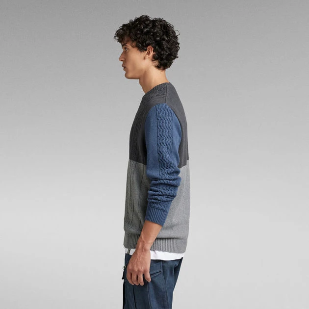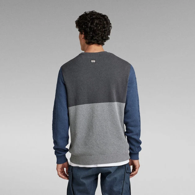 Knitted sweater Cable Color Block offers a loose fit. The contrast colored panels are emphasized by the knitted cable structure at the front and sleeves. Ribbed finishes add to a comfortable wear.