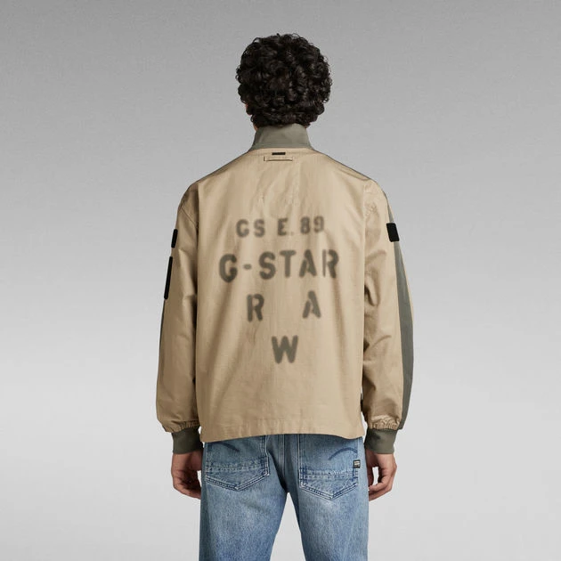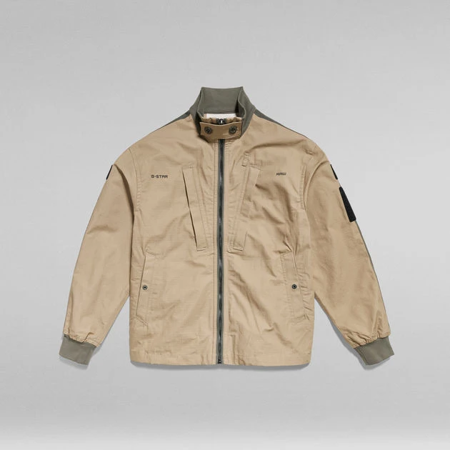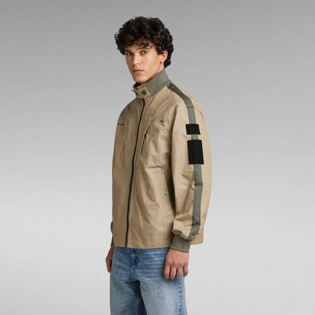 The design of Overshirt Combat Tape features a raised collar with a tab and button closure. Slanted zipper pockets are set at the chest and are combined with single welt pockets with a snap closure at the waist. Pull the elastic cord inside the waist for a tighter fit with more volume. The sleeves show a woven tape overlay and Velcro badge holders. Graphic prints at the upper back make this jacket complete.