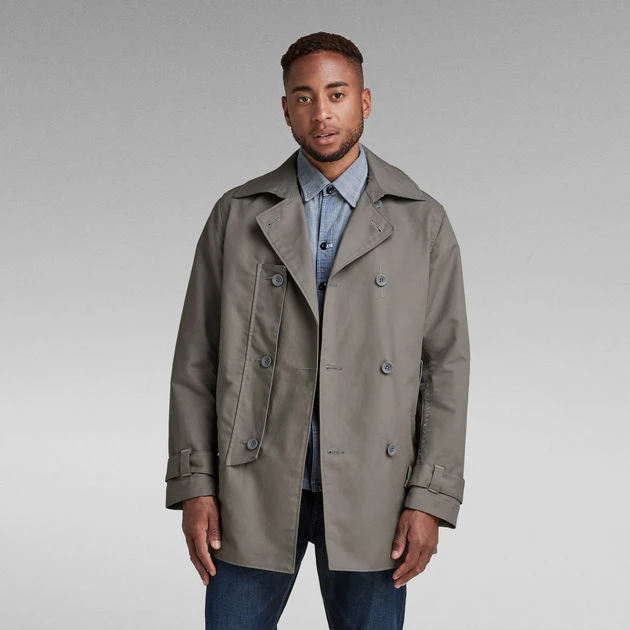 This double breasted trench coat is designed in a straight fit. Flap pockets at the front offer hidden snap closures that are indicated by a ‘stitch through’ embroidery. An additional pocket is placed at the inside. This coat has long sleeves with a strap at the wrist, where an embroidered graphic is placed just above one of them. The detachable throat latch allows for a raised collar when preferred.