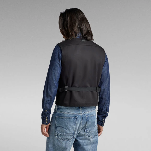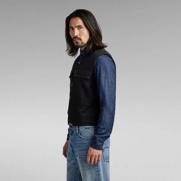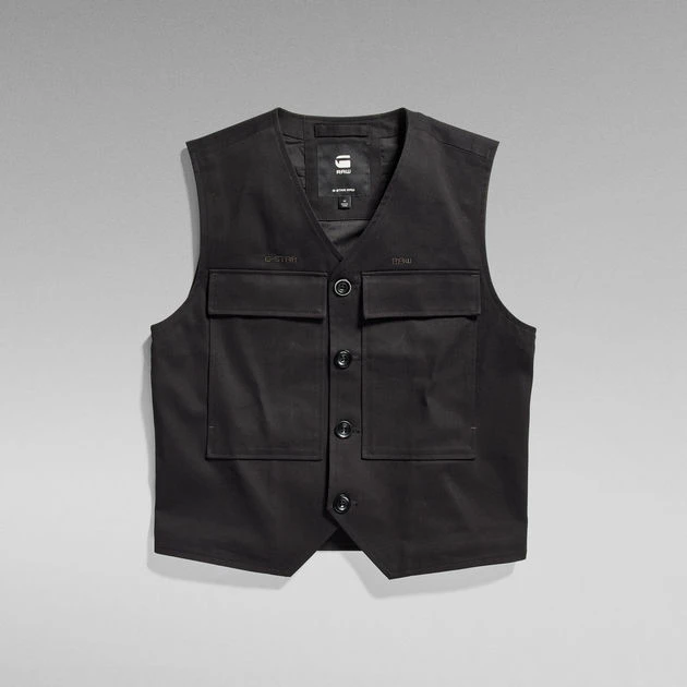 Waistcoat Field Pocket offers a V-neck with a button front closure. Deep flap pockets at the chest offer side entry pockets underneath. The belt at the back allows for a more fitted look when preferred.