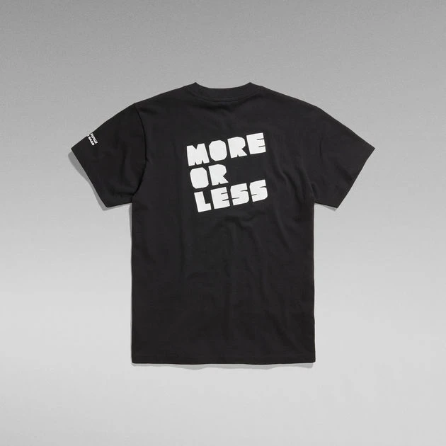 G-Star RAW and designer Maarten Baas joined forces to create art pieces made of denim waste shown during the ‘More or Less’ exhibition at Milan Design Week. A collaboration about our everyday dilemma and ongoing pursuit to make more out of less. Additionally, the ‘More or Less’ capsule collection was created. This statement tee offers a comfortable loose fit and ribbed neckline in organic cotton. The ‘More or Less’ print at the back is created in the signature font of Maarten Baas. The graphic print at one of the sleeves signs it off. This piece is offered in a limited edition.