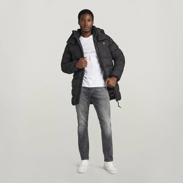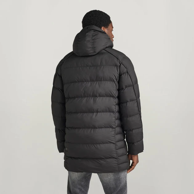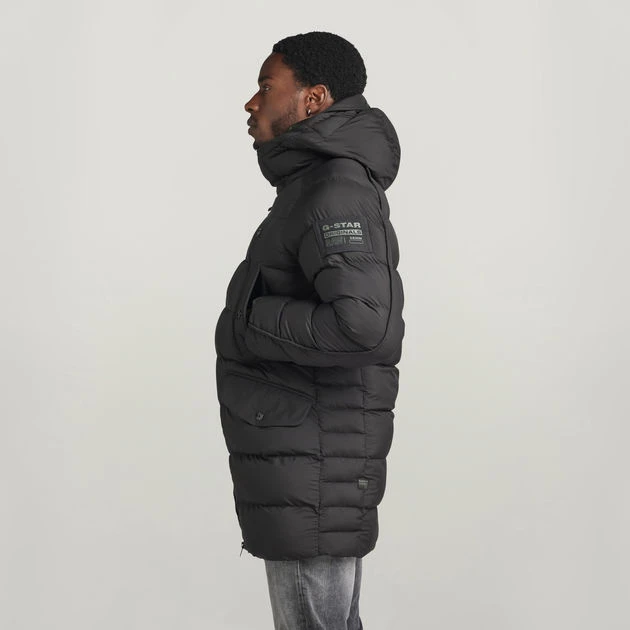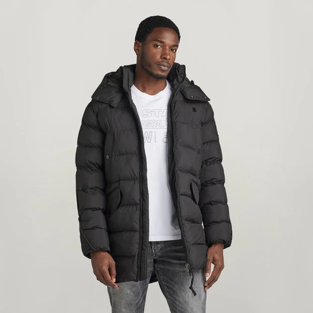This G-Whistler hooded padded parka is cut from a water repellent fabric, quilted in a horizontal stitch down. The detachable peak hood is constructed with a high raised front and offers pull cords inside for optimum protection. The peak can be fixated if preferred. The front zipper closure is covered by a panel with snaps to block out the wind. Also the waist is adjustable, as there is a puller cord hidden inside. A heavy piping runs alongside the back of the sleeves. This padded jacket offers pockets at the chest, waist as well as inside. The inside is finished with a graphic printed lining.