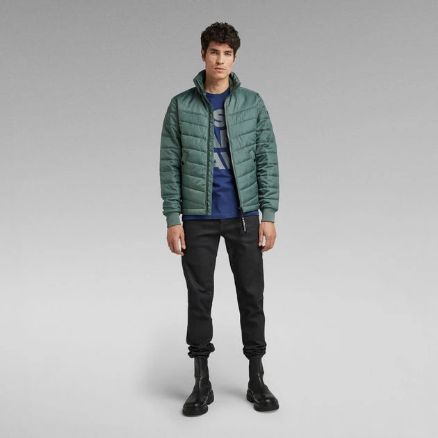 This light padded jacket is designed with a raised collar and a front zipper closure with pull tab that offers a wind catcher underneath. A zip pocket is added to the chest and broad welt pockets with visible snap closures at the waist. At the upper chest, a woven tape adds detail. The inside shows inner pockets and a loop hanger.
