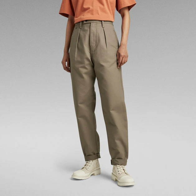 The Chino is designed in a loose fit and offers a pleated front. ‘Strike through’ embroidery stitches indicate the inset pockets. A coin pocket is integrated within. These chino’s show squared back pockets with a sewn-on button closure. Roll up the hems to complete the look.