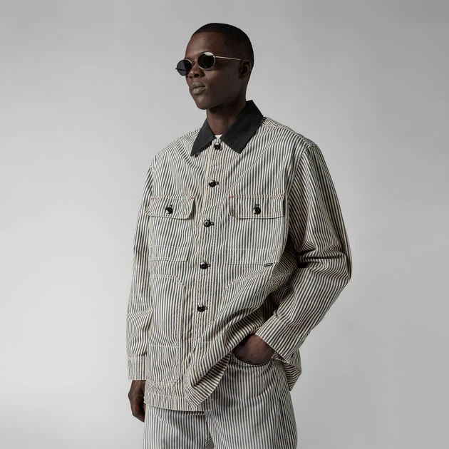 This 9 oz fabric features a unique hickory stripe pattern. The blue yarns are dyed in indigo in the warp by using a rope dye technique. Rope dyeing consists of twisting the yarns into a rope that is then quickly dipped into indigo baths. The short dyeing time does not allow the indigo to fully penetrate the fibers and allows for a faded effect.