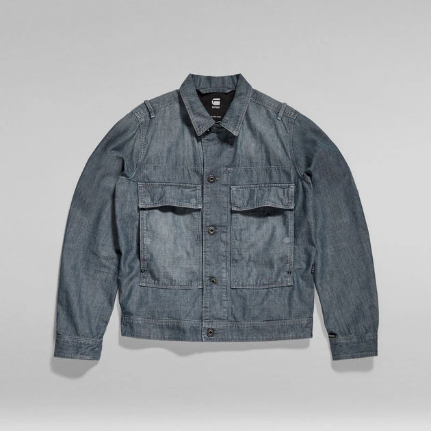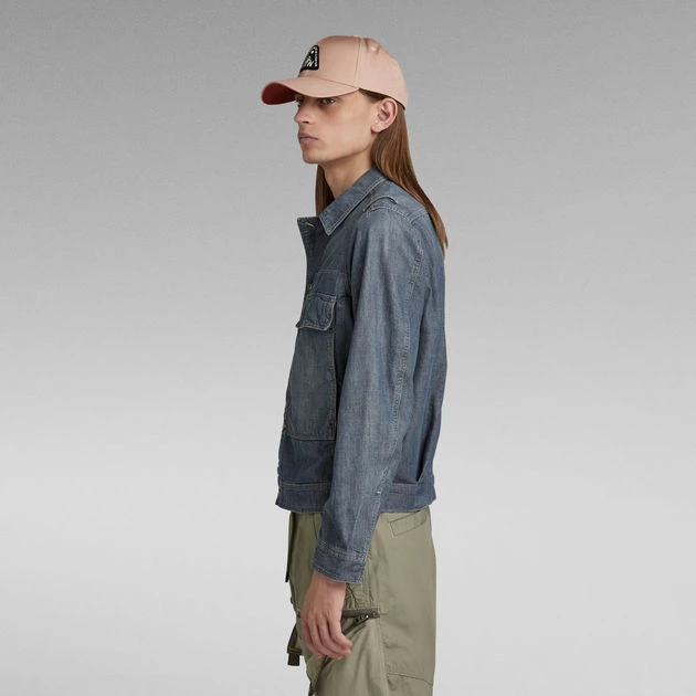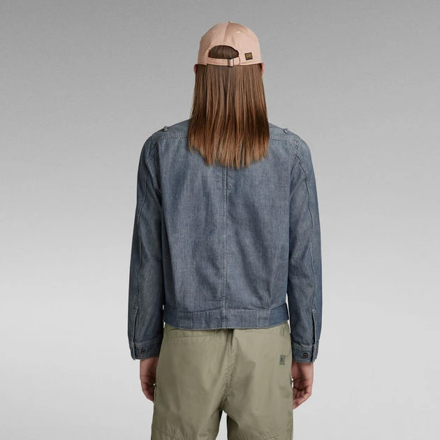 The design of this Utility jacket features flap pockets with additional side entry pockets. Hidden snap closures ensure a firm closure. Volume is created at the back by the folded pleats that are caught in the waistband. Shoulder loops with a strike through stitch create even more detail to this denim jacket.